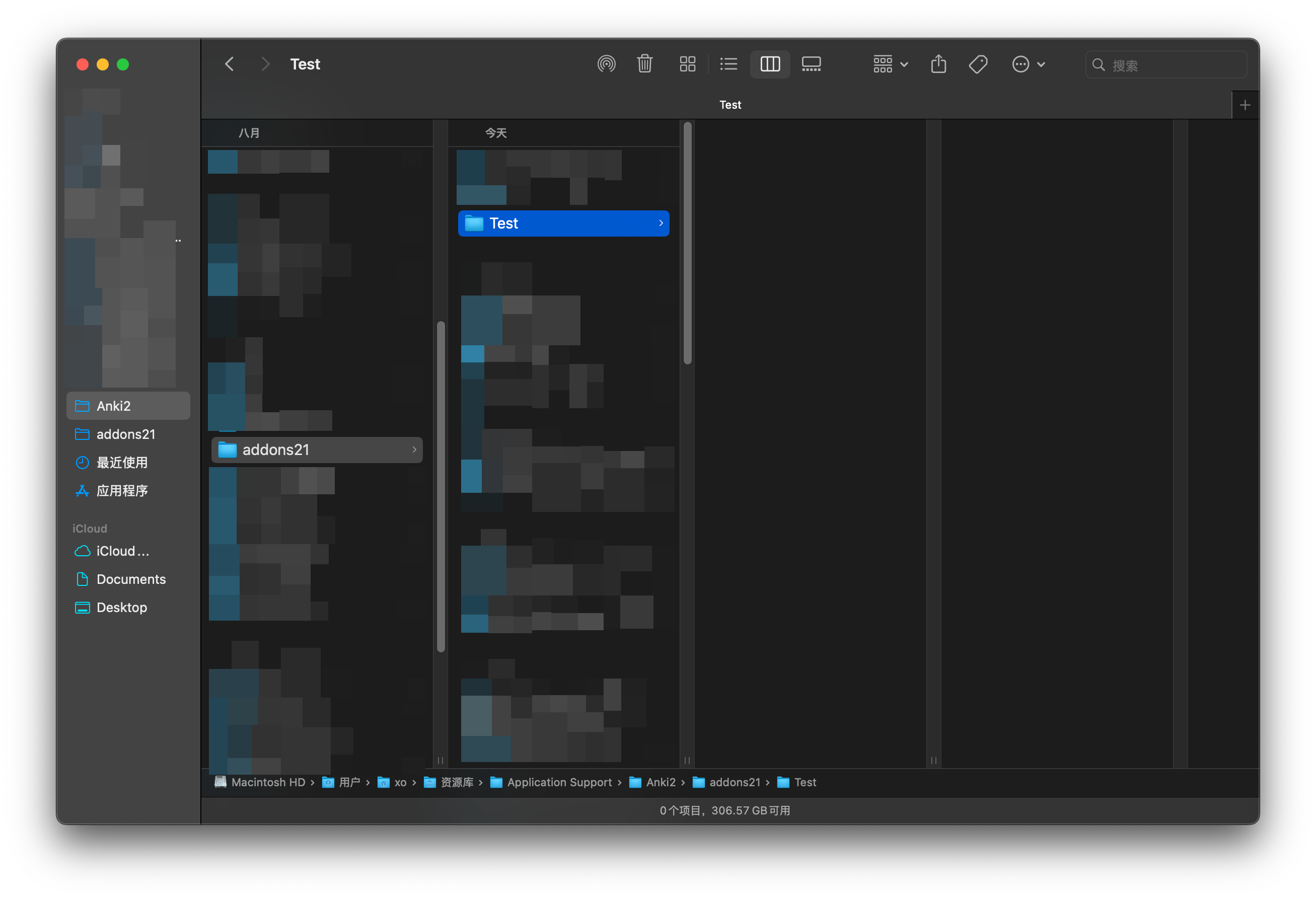进入 Anki 的插件目录 addons21,创建一个名为 Test 的空白文件夹