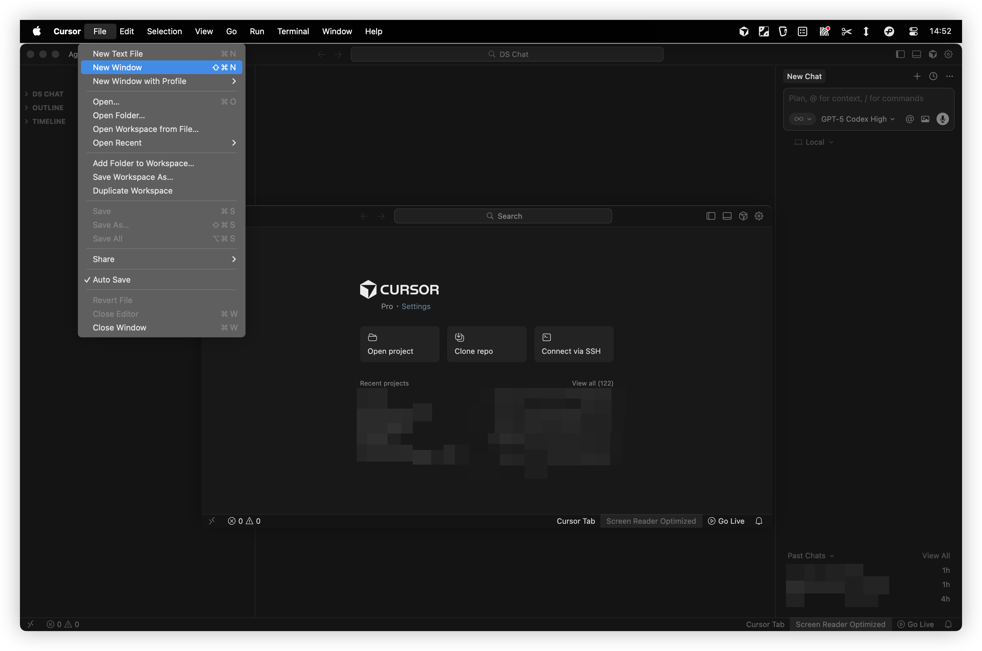 从 Cursor 菜单栏依次选择 File ⇒ New Window ⇒ Open Project