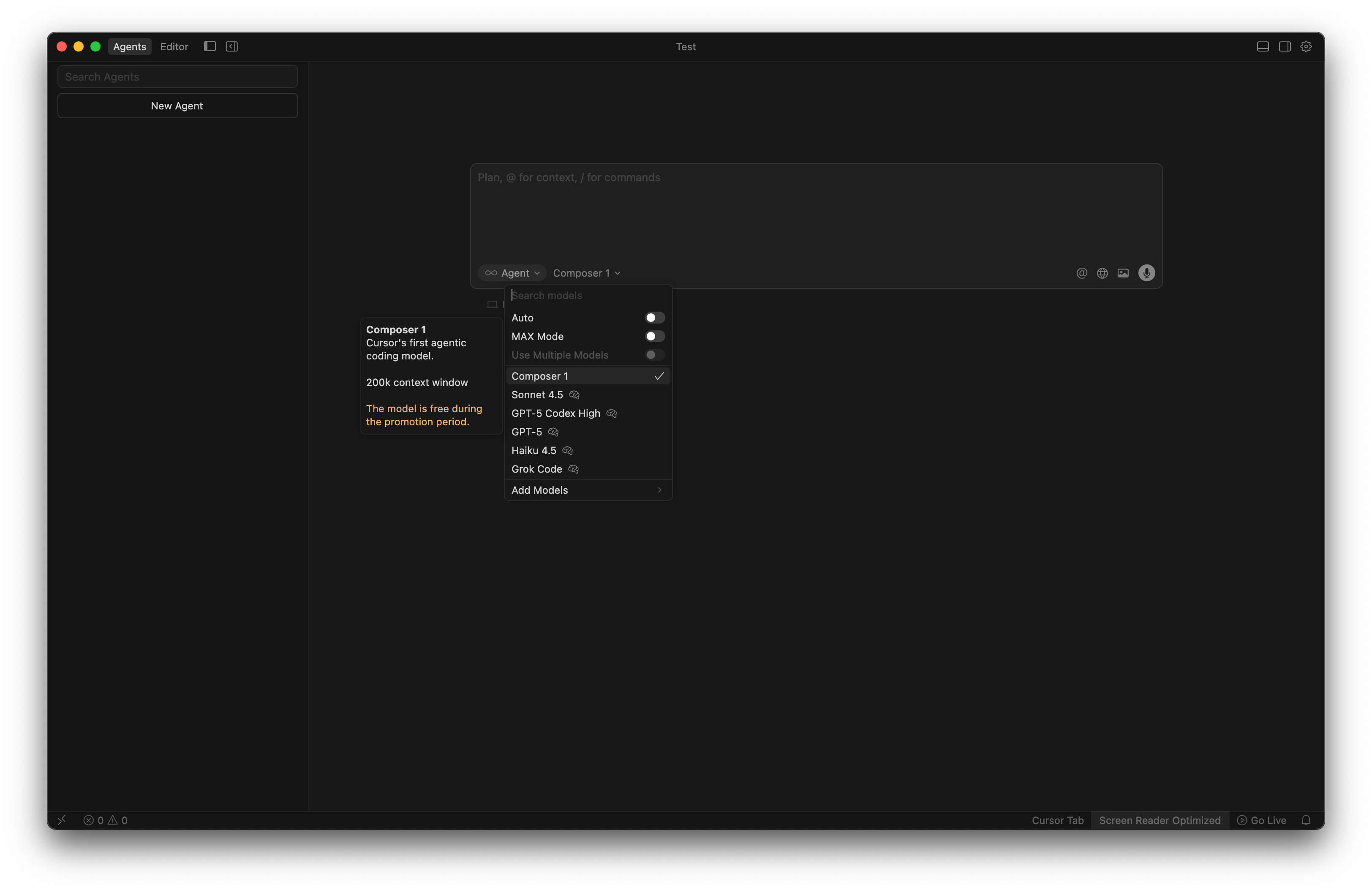 在 Cursor 里选择模型为 Composer 1(限时免费且无需专门网络)